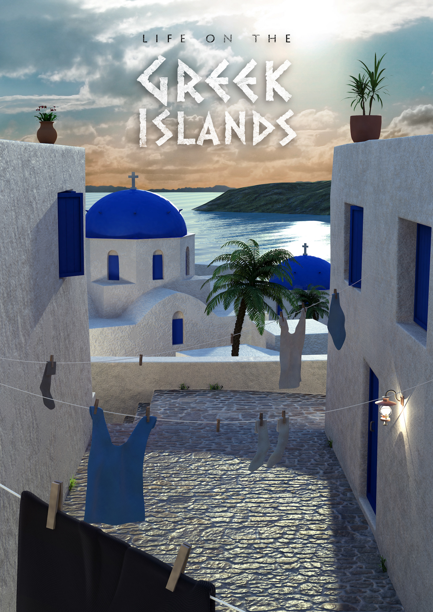 This brief asked for a poster created in Maya (with Photoshop adjustments allowed) that would advertise an imaginary documentary film about the Greek Islands, called 'Life on the Greek Islands'. I first began by researching the look and feel of the islands - and Santorini in particular - then sketching plenty of potential arrangements for a scene within the A3 frame. The brief also required a video to include a camera fly-through animation and turntables of objects.